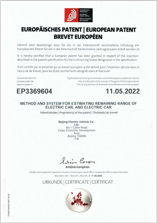 Recientemente, BAIC ha sido reconocido continuamente por las autoridades del sector por su creciente competitividad en el campo de los vehículos de nueva energía. Su modelo de nueva energía inteligente de gama alta, el ARCFOX αT ganó los premios "Los diez mejores chasises de China en 2022" y "El Auto Más Limpio" por el excelente rendimiento de su chasis y la fuerte capacidad de expansión de la plataforma de la arquitectura del chasis. Además, su patente de la invención "Método, sistema y vehículo eléctrico para estimar la autonomía restante de los vehículos eléctricos", que fue concedida por la Oficina Estatal de Propiedad Intelectual, pasó el examen de fondo europeo y fue autorizada por la Oficina Europea de Patentes, convirtiéndose en la primera patente en el extranjero de BAIC en el campo del control de vehículos eléctricos.